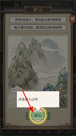 4、进入赶山界面后,点击赶山按钮,派遣族人进入山中获取收获,收获数量还会增加,助力资源积累发展。