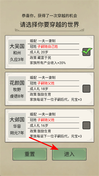 1、在穿越世界选择界面,选择大吴国世界,其拥有冠姓子嗣随己姓,开启穿越冒险,进入游戏世界选择。