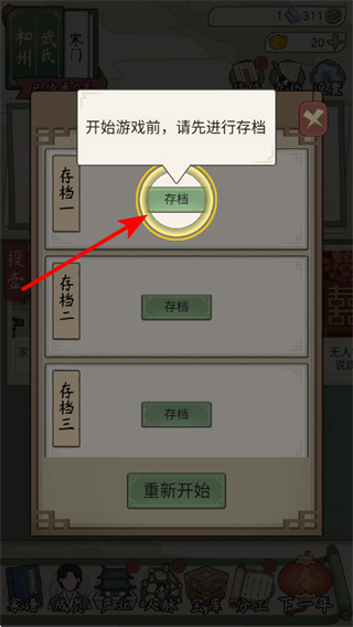 2、开始游戏前,点击存档按钮进行存档操作,存档可保障游戏进度不丢失,是保障游戏体验的重要步骤。