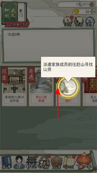 3、在游戏主界面,点击派遣家族成员前往赶山寻找山货的选项,开启赶山任务,推动家族发展重要途径。