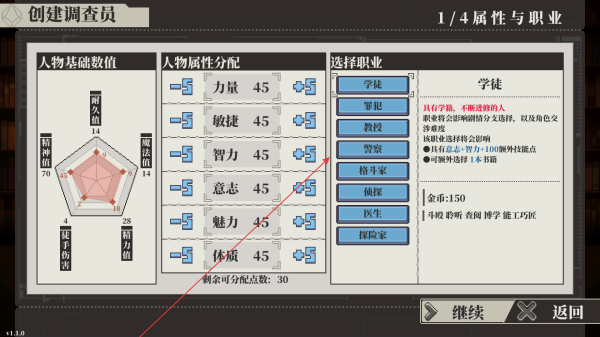 1、在创建调查员界面,依据剩余可分配点数,合理调整力量、敏捷等人物属性分配,随后从学徒、罪犯等职业中挑选,影响角色发展方向。
