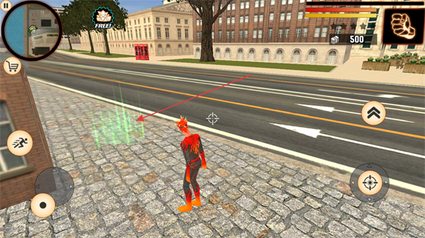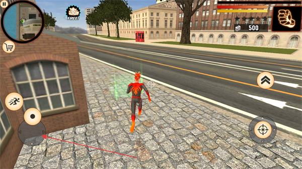 1、操控火焰英雄在城市街道移动,靠近绿色互动区域触发场景交互,推进流程。