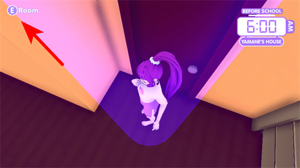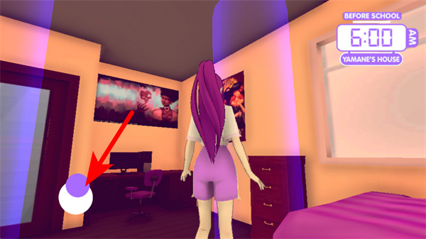 2、进入房间场景后,操控红色箭头指向的移动按钮,控制角色在房间内移动,熟悉当前场景的布局,日程活动做准备观察场景中的可交互区域。