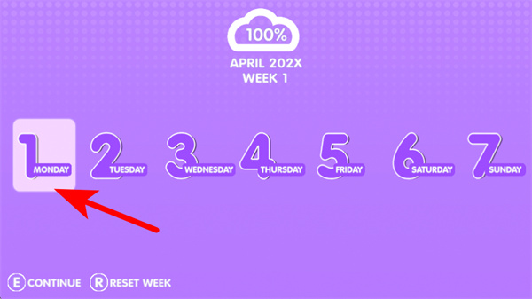 1、进入游戏周历界面后,点击红色箭头指向的1选项,选择周一开启本周的日程冒险,进入当日场景的关键操作,点击才能加载对应日程内容。