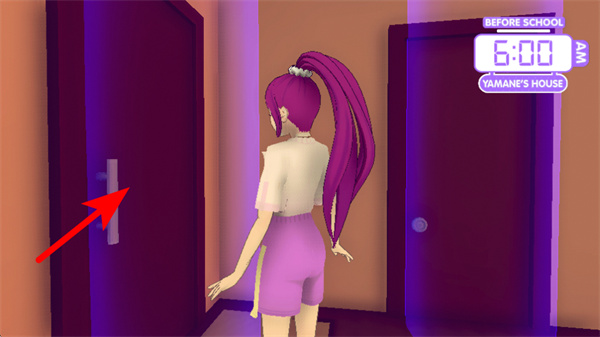 4、移动到房门区域后,点击红色箭头指向的门把手,尝试打开房门,推进日程中的外出环节,完成当前场景的互动操作以继续游戏流程。