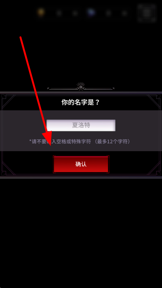 1、首先进入游戏,在名字输入界面,输入不包含空格或特殊字符且不超过12个字符的名字,输入完成后点击确认,开启在地狱之吻的剧情体验。