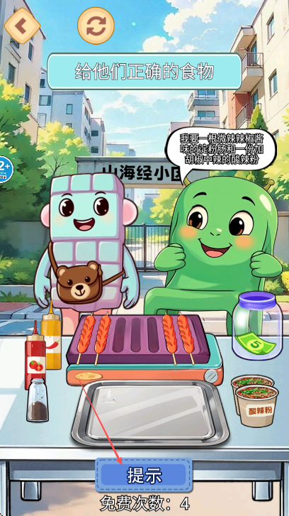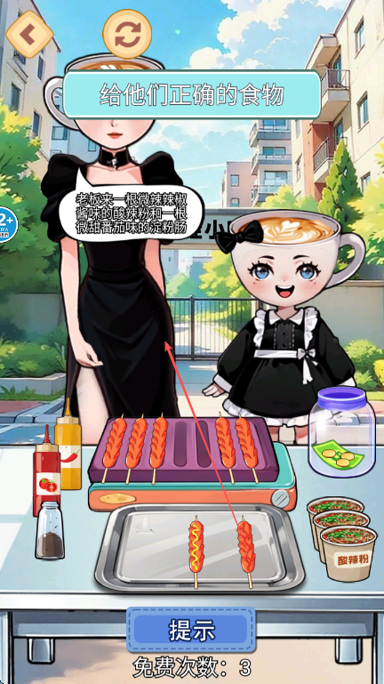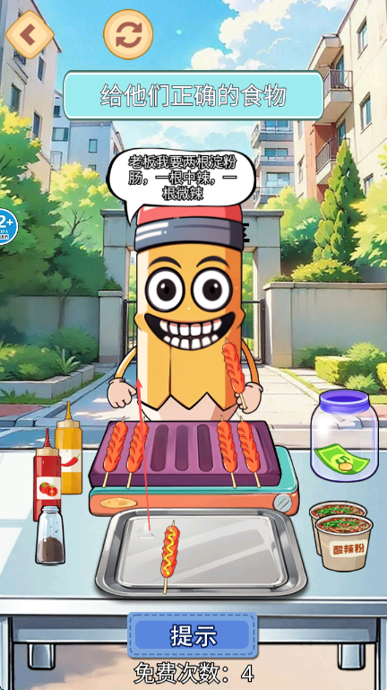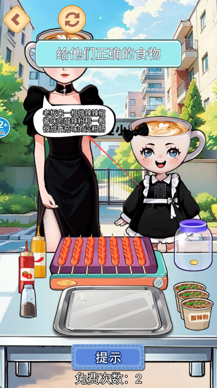 1、游戏开始,留意顾客对话气泡中的需求,像老板来一根微辣辣椒酱味的酸辣粉和一根微甜番茄味的淀粉肠。