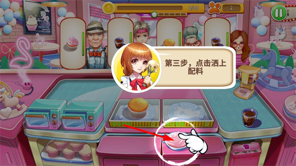 3、点击配料,将其洒在甜品基底上,完成甜品的装饰步骤。