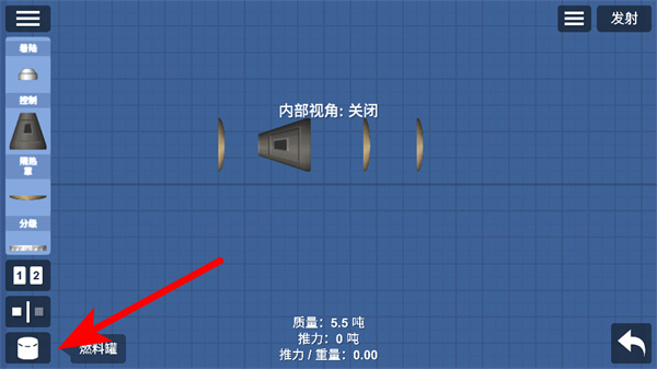 4、按箭头指引,添加燃料罐等组件优化火箭配置,调整推力与质量的比例,为后续发射做好准备。