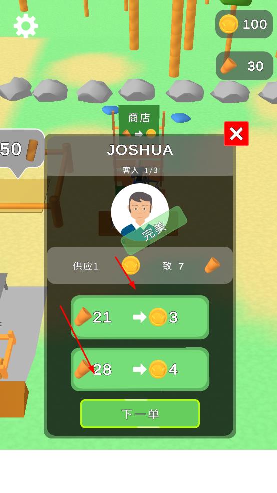 4、前往商店界面,根据客人需求如JOSHUA的订单,用木材兑换金币,获取经营收益,提升游戏内的资源积累。