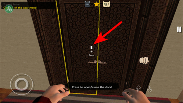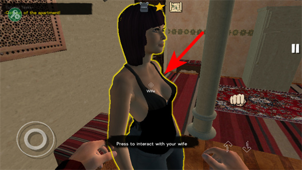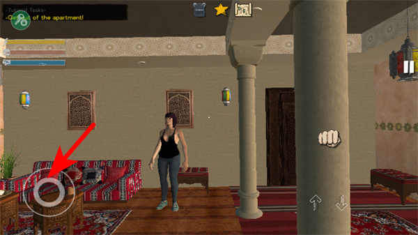 1、进入游戏后,点击箭头指引的选项,这是开启新对局的关键操作,点击后即可进入游戏的公寓场景。