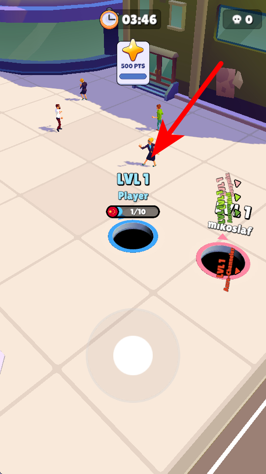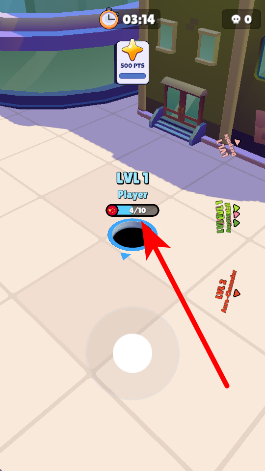 2、看到行人、小型车辆等目标,将黑洞移动过去,就能把它们吞噬,每吞噬一个目标,黑洞上方的进度条会增加,进度条代表吞噬的数量,积累到一定程度黑洞会升级。