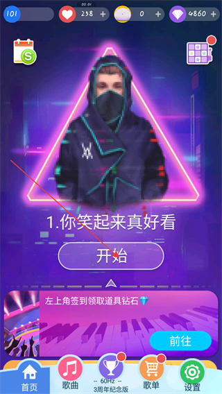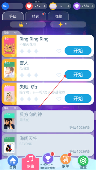 2、在下方的菜单栏中点击歌曲,跳转页面可以进行歌曲的选择进行挑战。