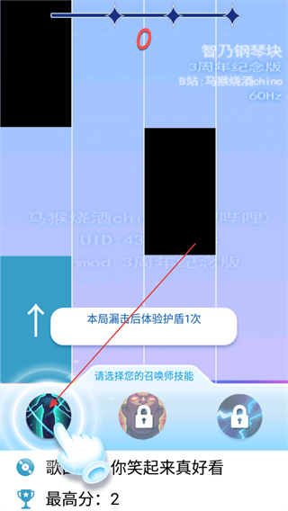 3、关卡内,可以选择下方的技能帮助你更好的完成关卡挑战,通过点击黑色方块获取积分完成关卡歌曲。