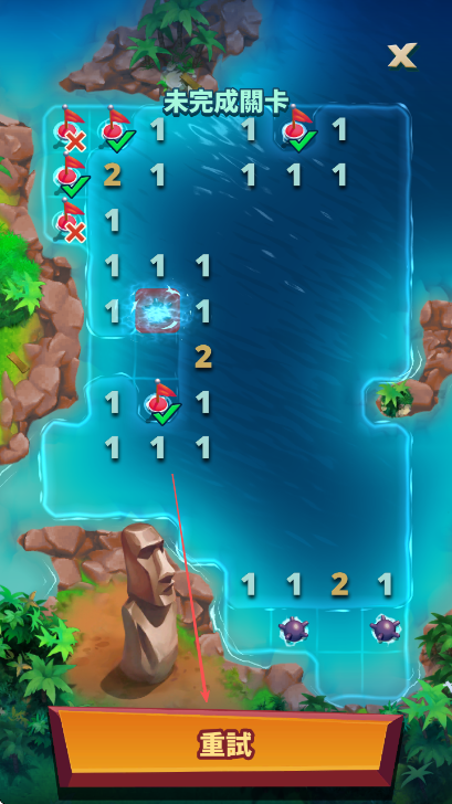 4、若标记错误导致游戏失败,点击重试按钮,重新开始关卡。