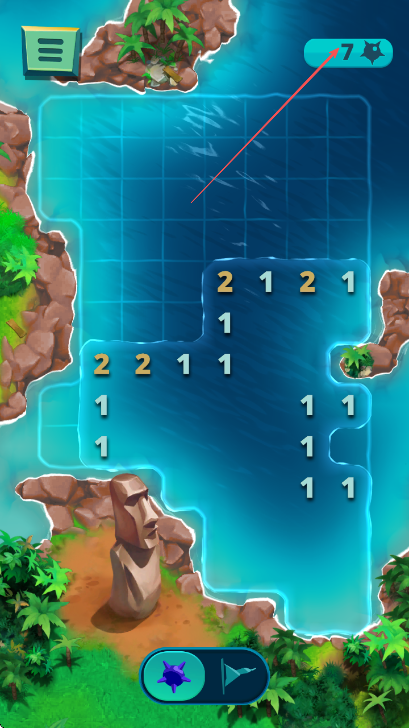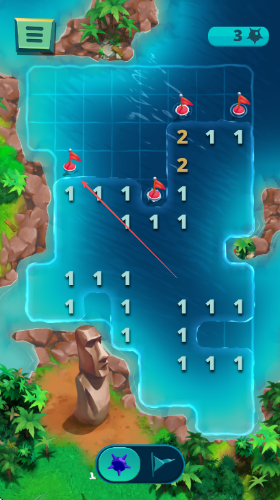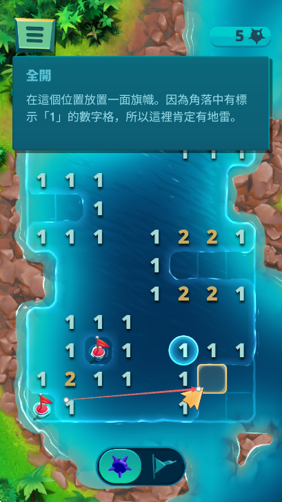 1、游戏开始,阅读提示信息,根据数字提示,点击箭头指向位置放置旗帜标记地雷。