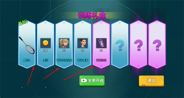 4、训练完成后,开启训练礼盒获取奖励,包括装备、金币、角色碎片等资源,助力后续训练与角色养成。