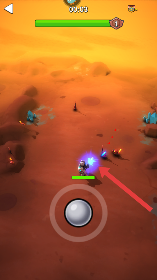 1、在游戏的荒漠场景中,操控角色发射蓝光攻击向目标发起射击,这是游戏初期的战斗操作,可消灭敌人。