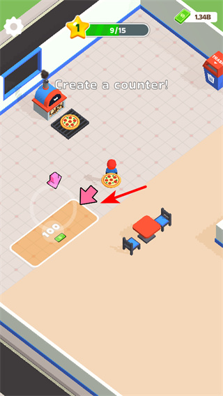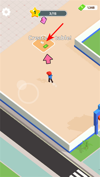 2、游戏中跟随箭头提示,点击对应区域来创建桌子,搭建餐厅的基础用餐设施,解锁经营条件。
