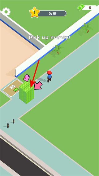 1、开启大门,操控角色靠近箭头指向的货币堆,完成拾取操作以获取初始资源,推进关卡进度。