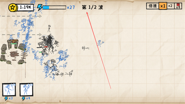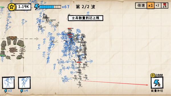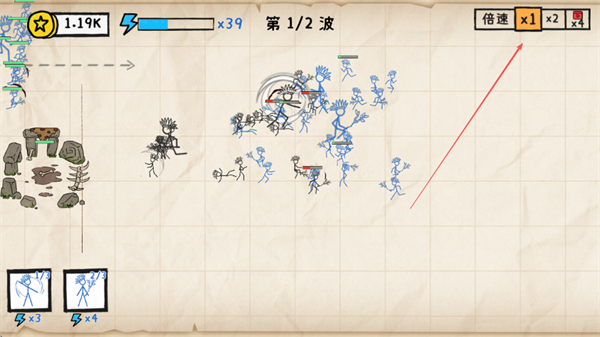 1、在第1/2波战斗中,派遣士兵与敌方交战,可点击倍速按钮加快战斗进程。