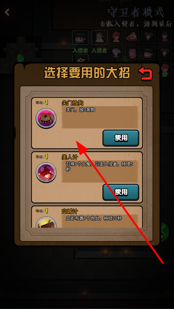 1、进入游戏后,挑选合适的大招,如关门放狗能放出3条狗,美人计可召唤女鬼引走入侵者,选好后点击使用,为抵御入侵者提供助力。