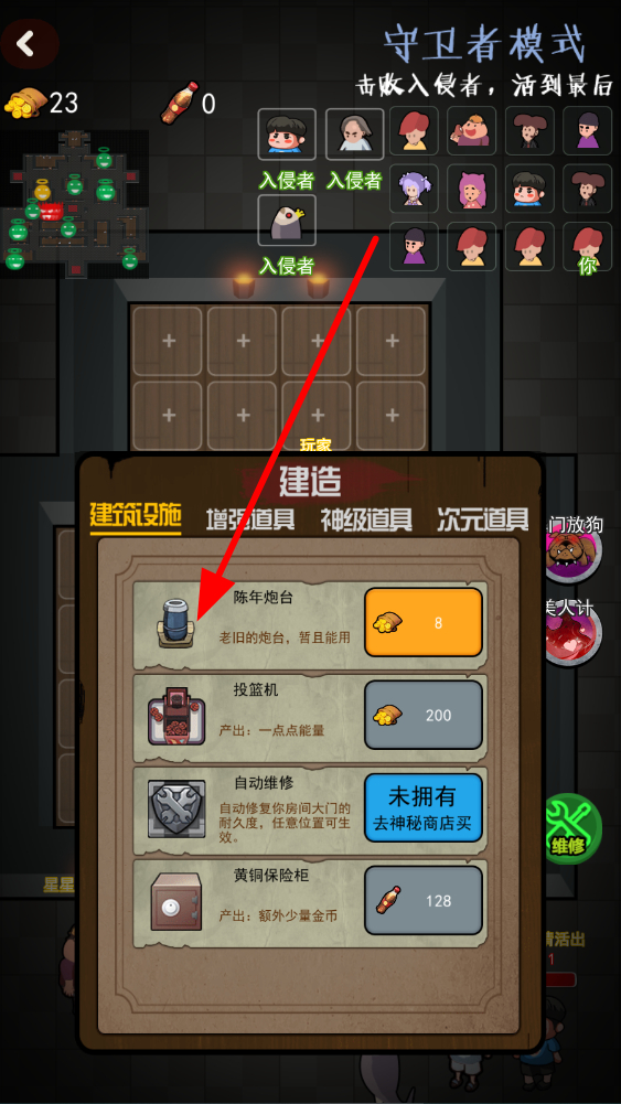 3、建造各种设施,像陈年炮台能进行攻击,投篮机产出能量,黄铜保险柜产出额外金币等,这些设施能增强守卫能力,更好地抵御入侵者。