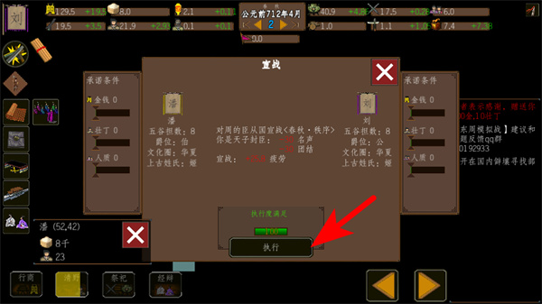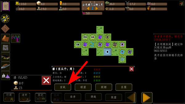 2、找到箭头标注的宣战选项,点击它触发势力互动,这是推进游戏进程的基础操作,按提示操作即可。