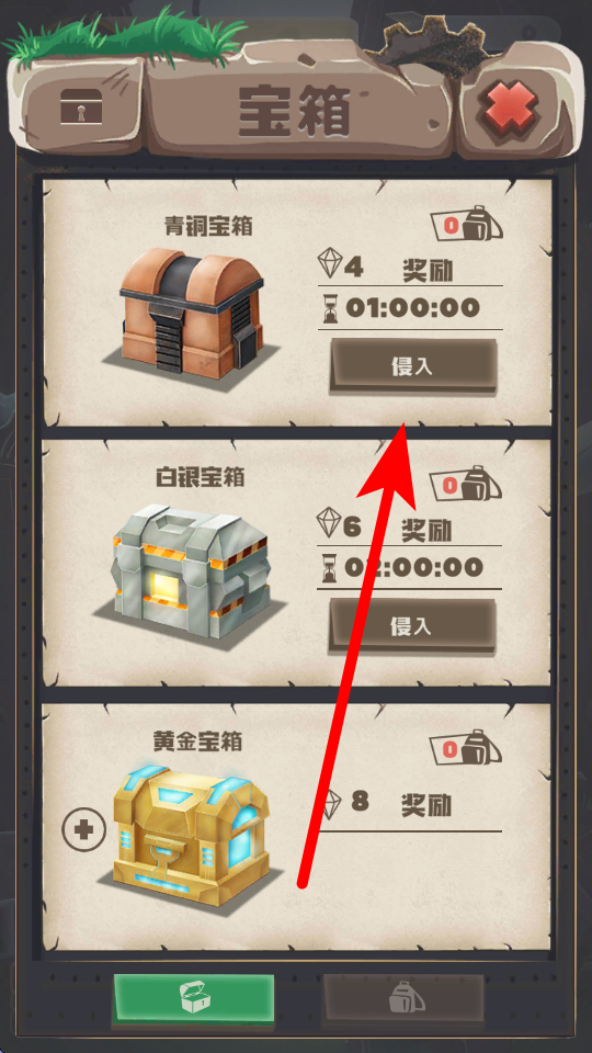 4、进入宝箱界面,能看到青铜、白银、黄金等不同宝箱,点击宝箱旁的侵入按钮,可尝试侵入宝箱,成功侵入有机会获取钻石等奖励,这些奖励可用于后续设备升级等操作。