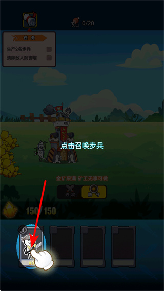 1、进入游戏点击界面下方的步兵图标,可召唤步兵单位,满足生产2名步兵要求。