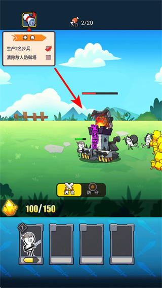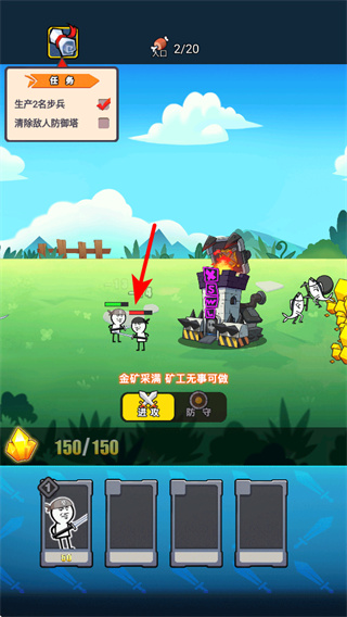 2、游戏中操控召唤出的步兵,向箭头指引的敌人防御塔移动,发起进攻推进战斗。