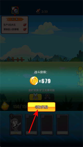 4、战斗结束后,点击领取奖励按钮,可获取本次战斗的金币奖励如679金币,积累资源。