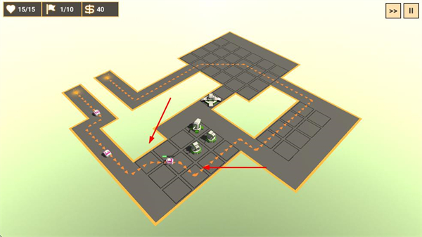 2、敌人沿路径来袭时,利用已部署的防御塔进行攻击,阻止其通过路径。