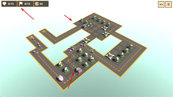 4、持续部署和升级防御塔,组成密集防御阵型,抵御多波次敌人进攻,保护阵地安全,争取防御胜利。