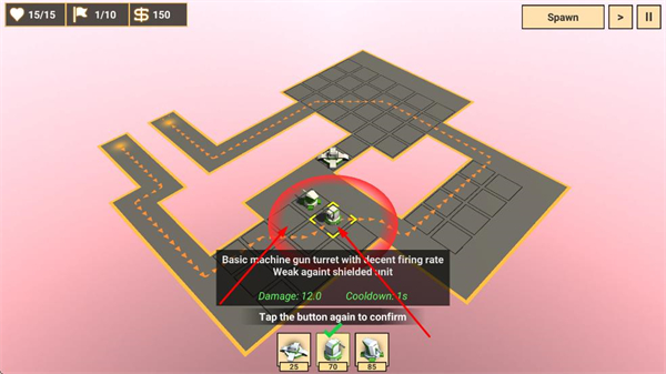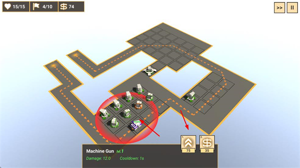 3、消耗金币升级防御塔如机枪塔升级后属性提升,增强防御塔的攻击能力,提升清敌效率。
