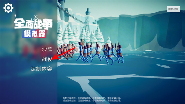 1、点击红色箭头指向的战役选项,可进入对应战斗模式,该模式下会生成预设的对战阵容,直接开启战斗流程。