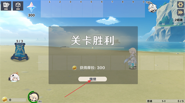 4、关卡胜利后可以获得300摩拉奖励用于购买道具,点击继续按钮进入游戏剧情。