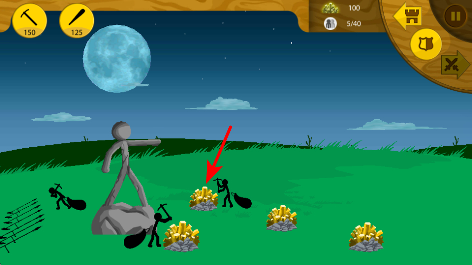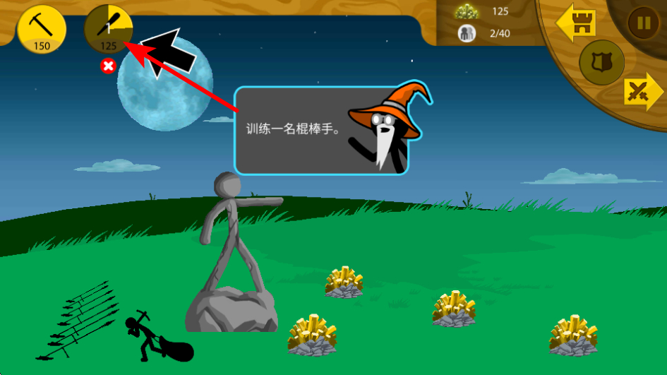 1、在资源积累足够后,点击棍棒手标识可训练该战斗单位,这些近战士兵是前期进攻与防守的核心战力,能协助矿工保护资源采集区域。