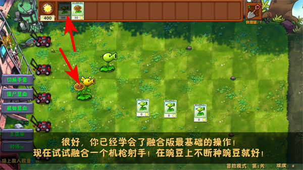 4、开始融合操作,在向日葵上种植豌豆,按照提示完成机枪射手的融合操作,提升植物的攻击能力,增强防御效果。