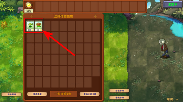 2、进入植物选择界面后,点击红色箭头指向的植物卡片豌豆+向日葵,选中初始作战植物,为后续种植与融合做准备。