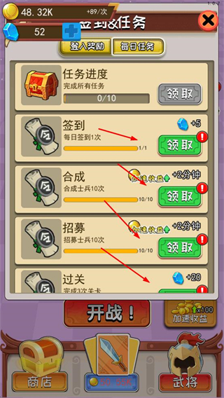4、打开主线任务界面,完成签到、合成士兵等任务后点击领取,获取资源奖励,推进游戏进程。