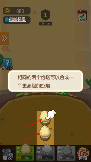 1、将相同的两个炮塔进行合成,可得到一个更高级的炮塔,以此提升战斗能力。