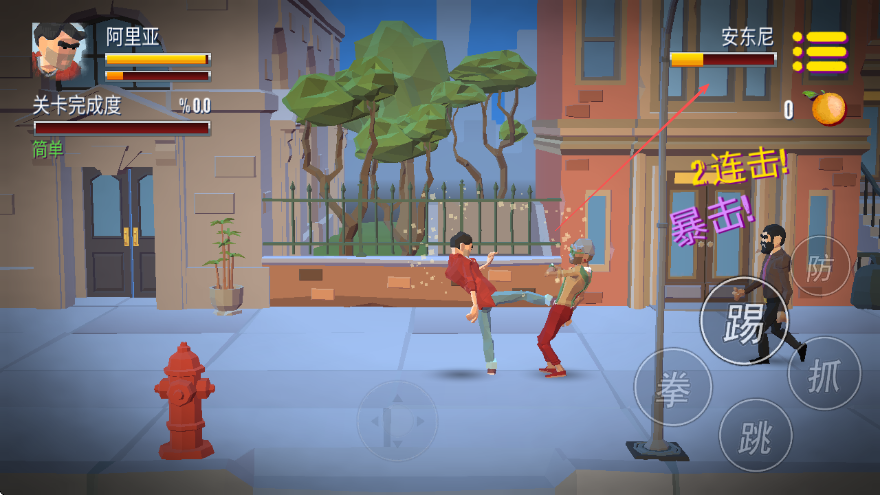 1、基础格斗操作:通过虚拟摇杆控制角色在街头移动,点击攻击键释放拳头攻击,遇到多个敌人时点击闪避键躲避围攻,避免陷入被动挨打局面。