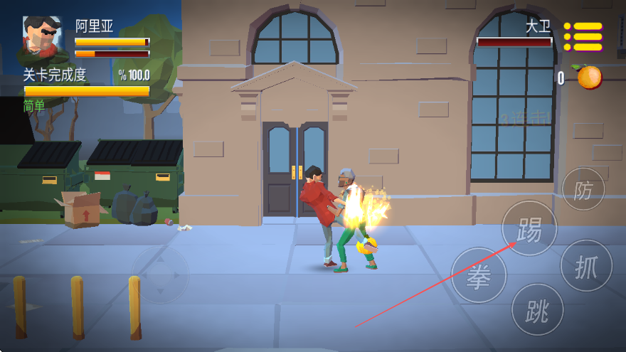 2、遇到敌人后点击屏幕右侧踢按钮攻击对手、降低敌人血量。
