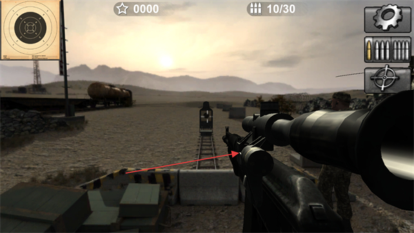 2、切换瞄准视角,对准靶标射击,消耗弹药,右上角显示10/30,开始积累分数。
