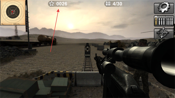 4、持续命中靶标,分数提升至0026,剩余弹药4/30,完成本轮射击。