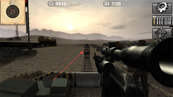 3、瞄准移动靶标命中,分数变为0010,剩余弹药显示7/30,继续射击。