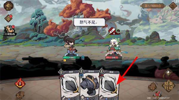 3、当出现怒气不足提示时,选择红色箭头指向的刺剑等基础技能卡牌,使用低消耗技能继续战斗,避免因资源不足导致行动中断。