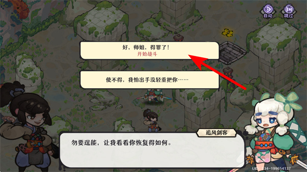 1、进入剧情选择界面后,点击红色箭头指向的开始战斗按钮,确认与师姐的对战选择,进入战斗环节,开启战斗关键操作。