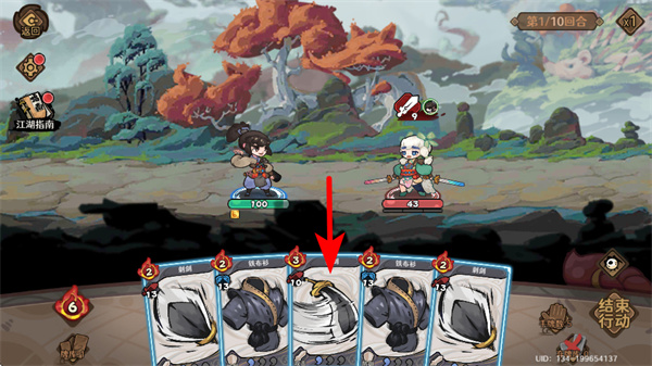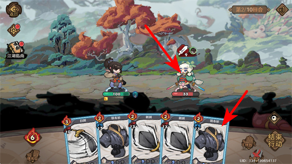 4、进入第2回合后,先点击红色箭头指向的敌方目标锁定攻击对象,再选择对应的技能卡牌释放,同时规划技能组合提升战斗效率。